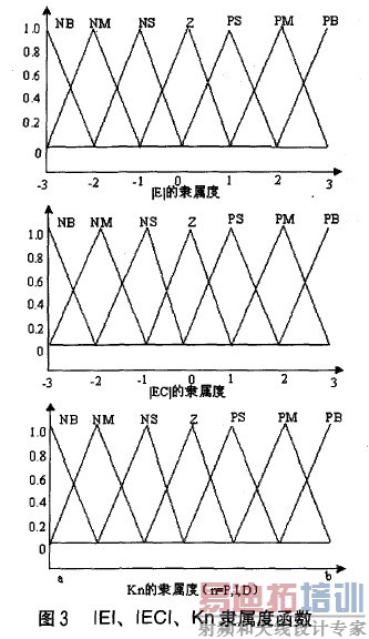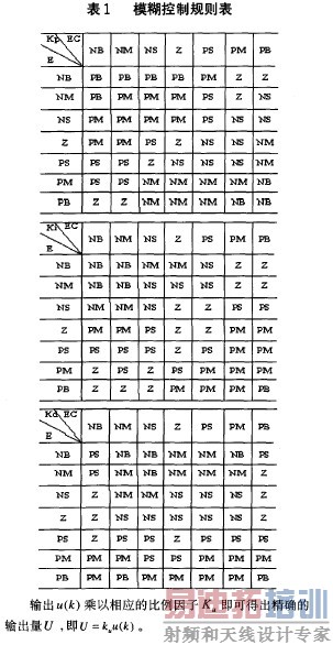 模糊一PID控制系统为双输人三输出系统,输入量为偏差E和偏差变化率EC,输出量为PID参数 ,K 和 。采用七种不同的模糊语言变量进行描述:负小(NS)、负中(NM)、负3v(NB)、零(Z)、正小(Ps)、正中(PM)、正大(PB),控制规则取为:if E and EC then K ,K, ,根据PID控制的基本原理,结合实际经验,设计模糊控制表如表1所示。