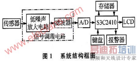 采集到的氢传感信号经过低噪声放大电路进行放大处理,并在低通滤波器滤除信号中的高频噪声。然后,经A/D转换器送入ARM处理器S3C2410,ARM 处理器再调用应用程序对采集到的数据进行数字处理,最后实时显示浓度值,并在浓度超出限定值时做出报警处理。整个系统框图如图1所示。