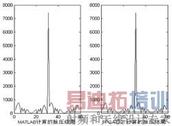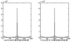 图4至图6分别对应时宽为60μs、20μs、6μs,带宽均为5M的线性调频信号。其中,左图对应MATLAB的计算结果,右图为FPGA芯片的输出结果。可以看到,FPGA芯片的输出结果和MATLAB仿真结果吻合。经测试验证结果良好,最大误差不超过-76db,在内部时钟频率80MHz条件下,完成1024点FFT 运行时间为146μs ,满足了雷达系统实时处理要求,达到了满意的效果。