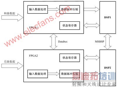 系统中,数据采样后分为和路和差路(包括航向差和俯仰差)两组数据,分别输入两片FPGA单独进行脉冲压缩计算,脉冲压缩后再送入后端的DSP做谱分析,以确定目标的距离、速度、方位等情况。由框图中我们看到,FPGA不仅要对数据做脉冲压缩计算,还承担了对输入数据处理和读写状态寄存器的任务。状态寄存器存储了脉冲压缩计算的控制参数,由后端的DSP根据分析的结果对其做相应的控制。