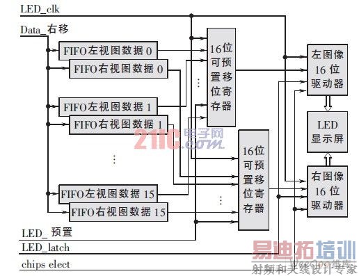 因为FIFO 中的数据格式是左、右视图列交叉显示,因此LED 控制驱动器的设计是以列驱动的。LED 时序发生器的设计如图3 所示,将立体图像对中左、右眼图像帧每个像素的数据用乒乓开关控制存储在FIFO 缓存之中,以16 个列像素点的驱动为例,FIFO 缓存之中的左、右视频数据分别各连接一个16 位可预置移位寄存器,通过16 个时钟脉冲的移位产生16 个像数的驱动数据,由片选信号选择显示行数,由D/T 转换函数f(i)作为LED_latch信号锁存,FIFO 缓存的数据经过8 次移位即可完成1 个像素的真彩驱动。