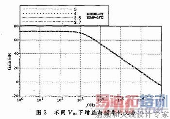 由图3~图4可见,在2.7~5 V的工作电压下放大器的增益和相位变化很小,其增益约等于72 dB,相位裕度约等于52°。