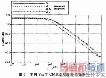 从图6中可以看出,在2.7 V时CMRR约为114 dB,在5 V时CMRR约为113 dB。