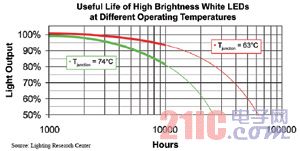 纹波电流还会增加LED耗电量,造成接面温度上升,并对LED的使用寿命产生很大影响。图4显示LED输出光强度与时间及接面温度的关系。我们设定80%的输出光强度为LED的使用寿命,则从图4中可看出,当温度从74℃降至63℃时,LED使用寿命会从10 000小时增加为25 000小时。