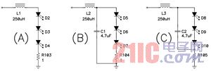 LED电源供应的电流回路设计要比传统电源供应的电压回路简单。电流回路的复杂性是由输出滤波架构决定的。图9就是三种常见架构,分别是单纯的电感滤波器(A)、典型的电源供应滤波器(B)和改良型滤波器设计(C)。