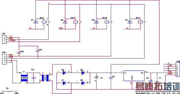 电源部分主要是将220V变成继电器控制电源和系统5V电源。7805前面的电压用于继电器控制电源,经过7805后产生的5V的电压经过0欧姆电阻之后进入控制板中,供整个系统用电。原理见图4-2所示
