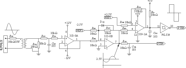 在市电故障时,为避免UPS的逆变器和市电电源切换瞬间对负载造成大的电流冲击,必须保证电网电压与UPS逆变器输出电压同频、同相和同幅值,本系统通过MR16单片机对电网电压采样及相位捕捉,并与建立的电网电压正弦表格相比较,经逻辑判断后控制逆变器输出电压的幅值和相位,从而实现与电网电压的同步。如图3所示,电网电压的正弦波信号经变压器降压再经-2.5V基准电压的提升,与+2.5V基准电压进行比较,在LM339的输出端经反向器后在PTE6口就可以得到与正弦波同频、同相位的方波信号,方波的上升沿为正弦波的零相位处,下降沿为正弦波的180°相位处,方波信号送到单片机的I/O口,单片机通过对I/O的检测就可以判断电网电压的相位。通过计算两次上升沿的时间间隔就可算出电网周期。UPS逆变器正弦波的产生,是通过在MR16单片机的ROM中建立一个正弦表,在中断程序中,由正弦指针读取正弦值进行脉宽计算,从而产生SPWM波形输出,正弦指针为零时对应的正弦波输出电压也为零,所以,当检测到电网零相位点时,可以考虑通过比较正弦指针的值来判断是否锁相,指针为零则表明逆变器正弦波输出与电网电压波形锁相同步,否则就要通过移相跟踪电网电压相位实现锁相。