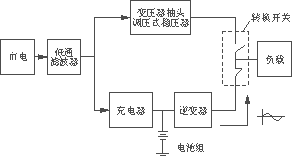 本系统采用的是后备式正弦波UPS,它适用于用电质量不高又要求不能断电的负载。它由充电器、逆变器、蓄电池组、静态开关等组成。系统工作原理如图1和图2所示。
