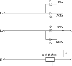 切换控制是通过通断切换电路中的静态电子开关(如晶闸管模块MTC)来实现的。本系统选用MTC70(70A/1200V)的晶闸管,如图4所示,图4中 L 1为电网进线, L 2为逆变器进线,N为两者的公共地线, R 为负载。图中采用晶闸管反并联连接,由于母线上流过的是正弦全波,以SCR1及SCR2为例,就必然形成在正弦波的正半周SCR2导通、SCR1关断,在负半周则SCR1导通、SCR2关断,这样就保证了流过负载的电流是完整的正弦波。