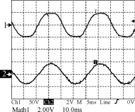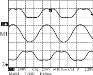 对于上面的第二、第三种SVPWM方式,利用TMS320F240为主控制器,构建了三相电压型 PWM整流器硬件平台。在实现整流器的PFC控制时分别采用了两种SVPWM进行试验,图7显示的是当PWM控制周期为0.2ms,正弦电压的周期为20ms,采用第二种PWM方式时,A、B两相的触发脉冲经过低通滤波器后的波形,中间M1是两相波形之差,即为线电压的波形;图8显示的是对应的采用第三种SVPWM方式时的波形。