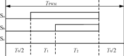 第二种是在一个PWM控制周期的开始先作用T0/2的零矢量,然后是T1/2的Ux,再是T2的 Ux+60,再是T1/2的Ux,最后是T0/2的零矢量,这儿零矢量的选择要根据Ux中的零的多少来定,Ux中零的个数是两个时就要选择0000,否则要选择0111。这种PWM方式在这三种实现方式种谐波含量居中,开关次数同第一种,也是4次。如图5所示。