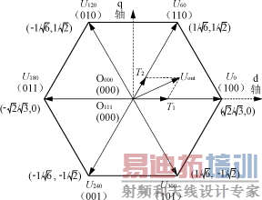 由式(5)可以计算出一个PWM周期桥臂中点的电压矢量URf,从其在d、q轴投影得到其 d、q轴的分量分别为Ud、Uq,那么CPU下一步就要由Ud、Uq的值计算出三个桥臂每个开关 管的占空比,从而给各个桥臂正确的触发脉冲。用什么样的算法来得到每个开关管的占 空比就是本节要讨论的问题。