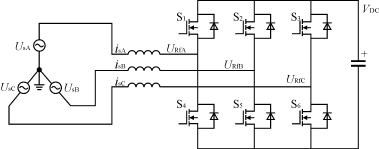 图1表示的是一个典型的三相电压型PWM整流器的结构。VDC为三相整流器直流侧电压, UsA,UsB,UsC分别为三相电网的相电压;URfA,URfB,URfC分别为整流器桥臂中点对三 相电网电压中点的电压值,它们的大小依赖于对应的桥臂上下功率开关的状态,isA,isB, isC分别为三相的线电流。