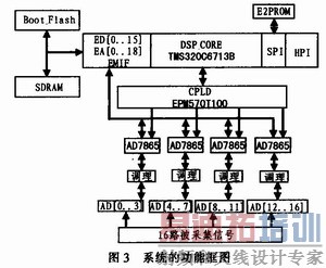 如图3所示,本设计的外围器件主要包括:双口RAM,用于与定点核DSP芯片(如TMS320F2812)交换数据;Boot Flash,当程序的大小大于192 KB,用于存储启动程序;SDRAM,用作运行部分程序的存储介质;CPLD,用于逻辑扩展;AD7865,用于采集电压电流的实时数据。