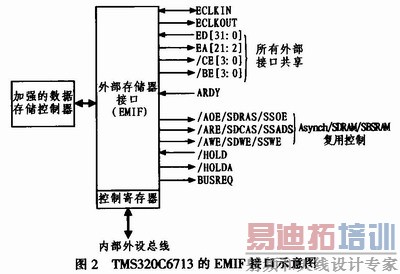下面就本次设计使用的TMS320C6713为例详细介绍一下EMIF。TMS320C6713的EMIF可以通过下面两种请求器处理外部总线请求:片内加强型直接存储器存取EDMA控制器;外部共享存储器的设备控制器。