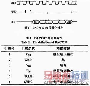 图1为DAC7512的写操作时序,其引脚功能描述如表1所列。