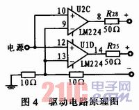 根据式(6)可计算得恒定电流输出范围为-50~+50 mA。由于运放输出功率有限,在负载超过其输出功率时,运放的输出电流会相应的发生变化。因此,电路中为了提高恒流源的输出精度,采用多个运放输出并联的方法增大输出功率,并联运放输出端电阻R25等用于消除输入失调电压的影响。多运放并联接法如图4所示。