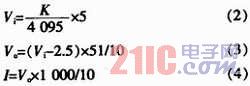 该电路初始化时发送电流控制字K=2 048,实现零电流输出。另外,实际电路中由于选用电阻本身的误差和运放输入失调、温漂等问题的存在,上述计算公式的零位和线性系数会稍有偏差,可以通过标定得到准确的系数和零位。