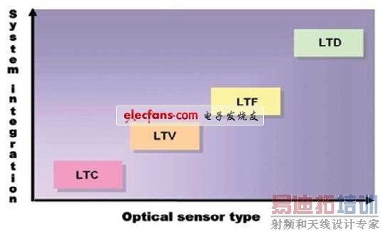 一旦根据转换类型、速率以及光谱响应缩小了选择范围,最后的选择就要基于其他标准,比如封装类型、温度范围,当然还有成本。典型的工作温度范围是商用(0~70℃),工业用(-40~85℃),汽车(-40~105℃)以及军用(-55~125℃)通常,成本与硅的尺寸成正比。并且,硅基尺寸越大,成本越高。光的应用倾向于更高的系统集成,见图1,集成度越高,传感器的复杂度越高,但各部件对应用所起的作用却越低。