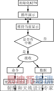 该部分软件的功能是完成对接收数据的识别、存储、变换和显示驱动,并可实现本地本机的自检,显示固化图像。当接收装置的译码芯片有输出时,单片机就中断当前的显示,接收标志字,然后判断此标志字的内容,确定将接收的是图像点阵,还是操作控制命令。若是点阵数据,就将其连续接收存放到一个显示缓冲数据库中,按当前的方式显示。若是命令,则立刻改变显示方式。