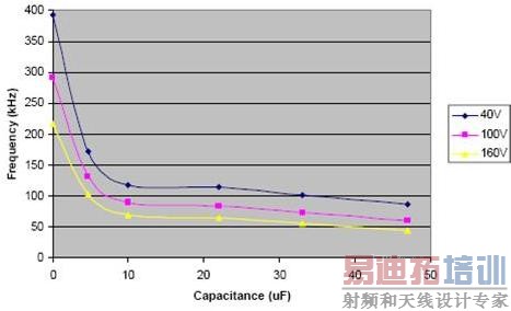首先,我们来看一下电感的影响,假设没有输出电容(COUT)的存在,这样负载电流和电感电流完全一致,能更清楚地说明电感的影响.下图给出了在输入电压的变化范围内,电感值对频率的影响.可以看出,输入电压对频率的影响很大,电感值在输入低电压时对降低频率有很大影响.(注:您的不一定是和参考图完全一样,我在此只是说明问题)