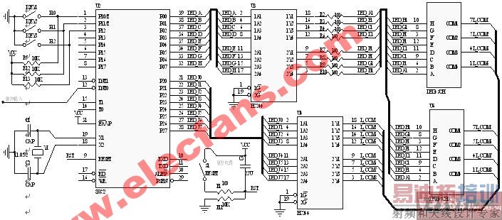 数码管驱动采用2个四联共阴极数码管显示,由于单片机驱动能力有限,采用74HC244作为数码管的驱动。在74HC244的7段码输出线上串联100欧姆电阻起限流作用。