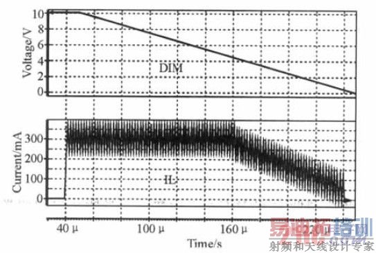 图7给出了当DIM输入典型值20 kHz、占空比为50%的PWM方波时, 输出电流波形。从图中可以看到在DIM引脚输入一定占空比的方波时,LED的平均电流与PWM方波的占空比成正比, 因此通过设定PWM方波的占空比, 就可以改变LED平均电流的大小。