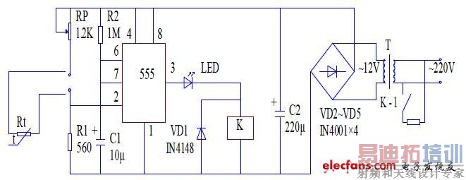 输出变为高电平输出,继电器K 导通,触点吸合,加热管开始加热,直到温度恢复到25ºC时,Rt 阻值变小,555 时基电路的2 脚处于高电平,3 脚输出低电平,继电器K 失电,触点