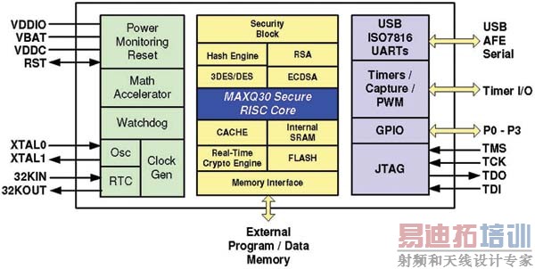Maxim公司针对金融终端、保密通信等高度安全设备市场,推出一系列安全 C,这包括DS5002、DS5250、MAXQ1103、MAXQ1850等。这些安全 C与一般处理器不同之处在于其安全性和保密性。安全 C除芯核、存储器、串行和并行接口外,还具有特殊的安全性能(图3):