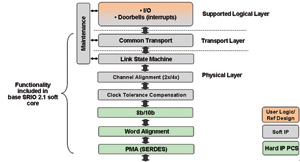 图2显示了如何使用低成本的可编程平台来实现协议栈。物理层和传输层使用标准的软IP核实现,但逻辑层还剩下许多可供用户定制的特性,以满足特定的设计要求。