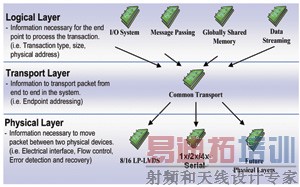 RapidIO规范是为各种终端定义的一种基于分组的技术,它最初是用于连接其他终端的数据包和交换的处理。如图1所示,该协议栈是一个三层协议规范,分为物理层协议、数据包传输(路由)层协议,以及逻辑层中的多种传输类型。