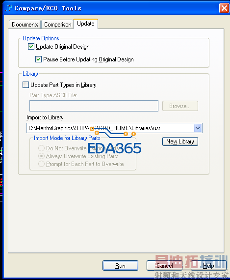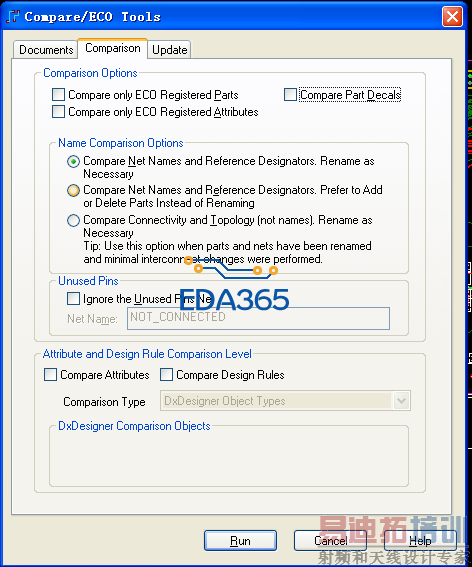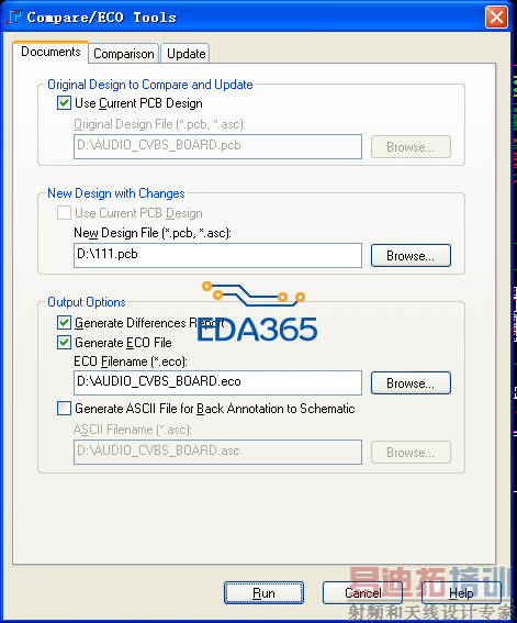 如果是ORCAD的原理图,先从ORCAD原理图中,导出.ASC文件(这个文件还要按PCB修改一下),再把PCB与这个修改过的.ASC文件对比(就如你所操作的,但不是PCB与PCB进行比较)这后输出一个.ECO文件。再在PCB中导入这个ECO文件,就完成更新了。