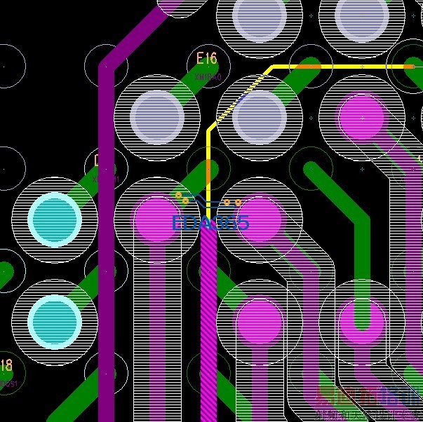 大家好,问题是这样的:图中BGA间距是0.65mm,via15/8mil,线宽是4mil,当我拉线的时候,到俩过孔之间就过不去了,间距太小。