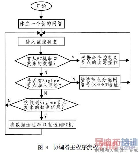 协调器上电初始化后,首先主动建立一个网络,然后等待路由节点和叶节点的加入。如果发现有节点申请加入网络,则给该节点分配网络号。同时协调器还要监控PC机服务器从串口发来的命令数据,根据相应的命令来控制某个节点,比如设置节点灯光控制信息、设置节点时段控制信息、读取节点灯光控制信息、读取节点时段控制信息等。如果是要某个节点读取相关信息,还要把读到的数据信息通过串口发送到PC机。协调器软件工作流程如图3所示。