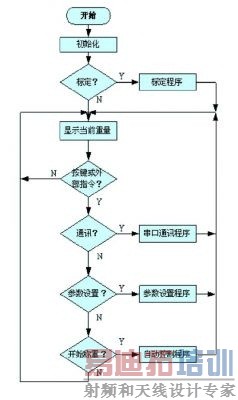 软件设计主要在CCS 软件下由C语言设计完成。主程序流程图由图5 表示。程序主要包括:初始化,标定程序, 显示程序, 串口通讯程序, 参数设置程序, 计算质量程序, 自动控制程序等模块。