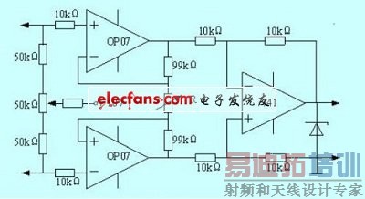 信号调理 电路主要完成模数转换前的信号的滤波和放大, 由于本设计采取软件滤波, 所以主要考虑信号的放大问题。在现场应用中,以10V 电压激励灵敏度为2mV/V 的称重传感器,其满量程输出信号电压为20mV。F2812 内置A/D 转换器的输入电压为0-3V,所以必须设置放大电路。设计采用由3 个运算放大器组成的仪用放大电路(图2)。电路中左侧两个OP07 组成第一级差分放大电路,右侧OP07 为第二级差分放大, 调节1k Ω可变电阻即可调节电路的增益。经计算要使增益调节达到15 0 倍,需要将可变电阻R 调节到1.33 Ω。采用此种电路输入阻抗高,共模抑制比高。为了防止意外情况下输入电压超过DSP 的工作电压而损坏芯片,在信号输入DSP 引脚之前还需外接一个3V 的稳压管。