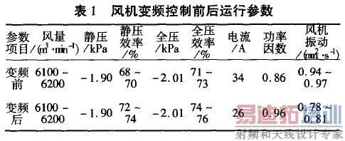由此可见风机实现变频运行后,风机的启动性能得到改善,风机振动降低,电机功率因数明显提高,风机效率明显提高,电机运行电流下降,电能消耗明显降低,实现了节能效果。