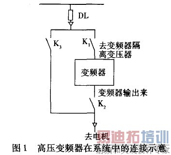 变频装置与主扇风机的连接方式如图1所示。DL为主扇风机6kV开关;K1、K2、K3为变频装置隔离刀闸,K3为工频刀闸,K1、K2为变频刀闸;6kV电源经变频装置输入刀闸K1到高压变频装置,变频装置输出经出线刀闸K2送至电动机;6kV电源还可以经旁路刀闸K3后直接启动电动机。进出线刀闸(K1、K2)和旁路刀闸(K3)的作用是:一旦变频装置出现故障,即可马上断开进出线刀闸,将变频装置隔离,手动合旁路刀闸,在工频电源下启动电机运行。