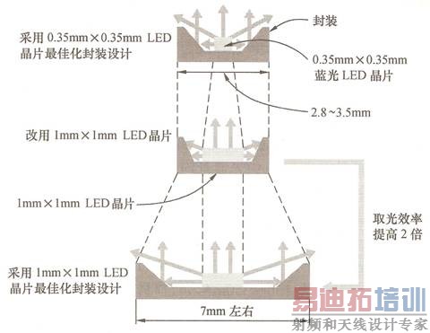 小型LED芯片的发光效率的提升似乎比大型LED芯片模块更有效。例如日本CITIZEN公司组合8个小型LED芯片,达到60lm/W的高发光效率。若使用日亚公司制作的0.3mm×0.3mm 小型LED芯片,一个封装模块最多使用12个这样的芯片,各LED芯片采用传统金线粘合封装方式,施加功率是2W左右。