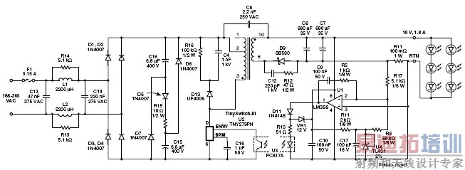 图1所示反激式转换器使用了TinySwitch-III系列的一个器件(U2,TNY279PN)给6个高亮度流明LED(LXHL系列)提供高达1.8 A的负载电流。