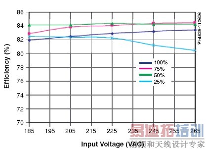 图 2. 在不同负载时效率和输入电压的关系,在室温和50 Hz工频下