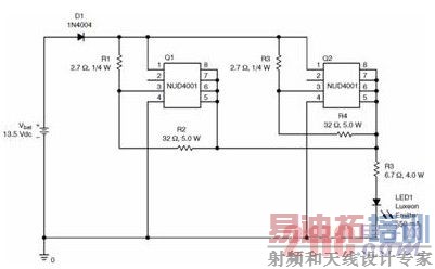 在线性驱动器方案,典型产品包括安森美半导体的NUD4001及NUD4011线性LED驱动器,两款器件的额定输入电压范围分别为6至30 V和48至200 V,额定输出电流分别为高达500 mA和高达70 mA,在汽车中的应用领域包括尾灯、方向灯、刹车灯及车顶灯等。这两款器件的设计均用于在交流-直流应用中替代分立方案,设计人员能够利用外部电阻针对不同LED阵列设置驱动电流。不同的是,NUD4001适合于5 V、12 V或24 V的低压应用,而NUD4011则最高支持200 V电压。图4显示的是NUD4001在汽车停车灯中的应用。