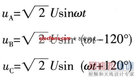 对称三相电源通常由三个频率相同、幅值相等和初相角为1200的正弦电压源按一定方式连接而成,三相信号可依次称为A、B、C相,记为uA、uB、uC,它们的瞬时表达式如下: