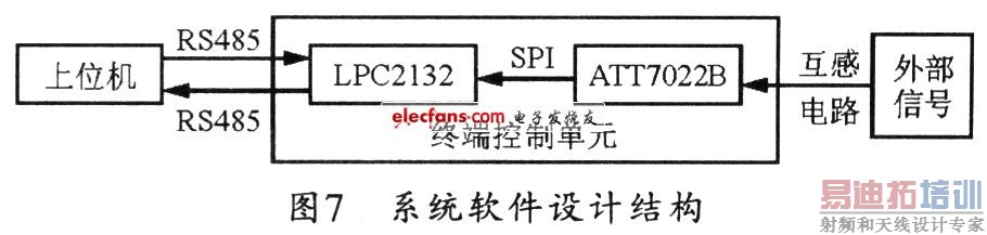系统中的上位机通过RS485串口与系统通信,其功能芯片ATT7022B也利用串行模式与系统控制核心LPC2132相互交流数据,图7所示为本系统的软件设计结构。
