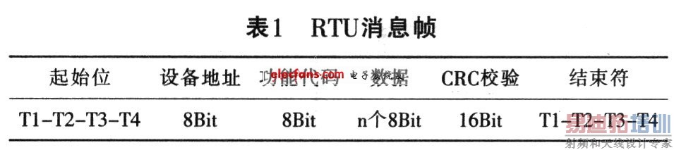 本监控终端与上位机之间的通信采用Modbus通信协议。该协议是用于电子控制器上的一种通用语言。通过此协议,控制器相互之间、控制器经由网络(例如以太网)和其它设备之间就可以通信,该协议也支持传统的RS232、RS422和RS485等接口。传统的Modbus协议分为ASCII模式和RTU模式,考虑到配电系统的高效性和安全性,这里采用RTU模式。使用RTU模式,消息发送至少要以3.5个字符时间的停顿间隔开始。并在最后一个传输字符之后,应通过一个至少3.5个字符时间的停顿来标定消息的结束。一个新消息可在此停顿后再开始。整个消息帧必须作为一个连续的流来传输。如果在帧完成之前,有超过1.5个字符时间的停顿时间,那么,接收设备将刷新不完整的消息并假定下一字节是一个新消息的地址域。同样地,如果一个新消息在小于3.5个字符时间内接着前个消息开始,则接收设备也将认为它是前一消息的延续,而这将导致一个错误,但该错误可以利用CRC校验来发现,其典型的RTU消息帧如表l所列。