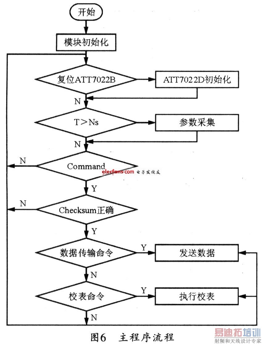 本设计采用C语言在keil C平台上来编写操作软件,以完成上位机(PC机)与终端间的相互通信。系统软件主要包括主程序、初始化程序、ATT7022B复位程序、SPI通讯程序、数据采集序、数据发送程序、以及中断程序等。图6所示是其软件程序主流程。