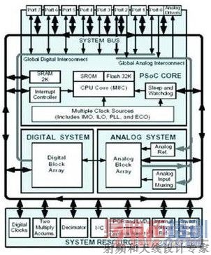 EZ-Color控制器是Cypress生产的专门针对高亮LED照明混色应用的可编程片上系统芯片。它主要由8位微处理器,可编程模拟模块和数字模块,外加硬件乘法累加器,I2C,Flash, SRAM等周边外围模块组成,如图1所示。