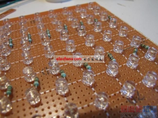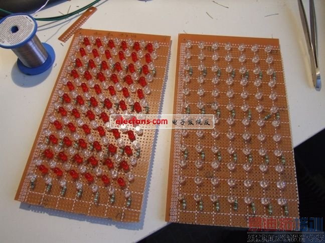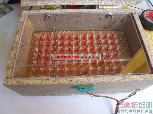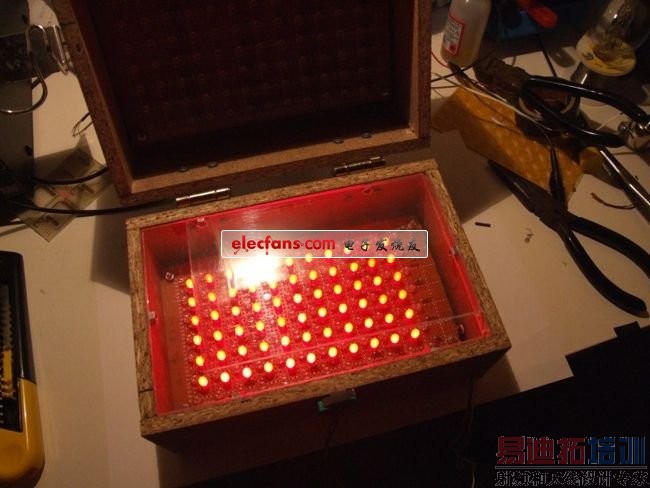 我用的盒子的内壁粘按住底部4毫米面板厚的有机玻璃坚果。选择是简单的东西很容易获得。坚果 不要使用普通玻璃,因为它阻止紫外线。没有顶部面板安装,因为它是调整过程的一部分:我把底部的第一部电影,那么,第二片板是贴在一个较小的一块有机玻璃。对齐方式对齐的有机玻璃小片,使两个层重叠完美。具有电影连接到它更容易。外板的额外标记帮助这个(鬼孔)。第二部分应载有关于使双面电路板的详细教程。 最后的组装允许大小约10x15厘米的电路板面积,与暂时18厘米长,宽,5.5厘米11厘米为两个半深中的每一个内部尺寸。外观尺寸将取决于所用材料的厚度。每板含有7 × 3和4分别为它们之间的孔(间LED的中心实际间距是一样的)12紫外发光二极管。之间的LED的顶部与板的距离是3.5CM,包括有机玻璃面板的4mm。看看下面的细节上看到一个正常的0.1“或1.27间隔板的LED安排:
