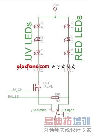 该图显示,象征,红色和紫外线LED通过基本单元是在面板重复阵列:三个系列LED和一个电阻。正如你可以看到,有没有办法打开紫外线灯盖打开时,即使这样的命令将来自微控制器。微控制器可以将通过MOS晶体管的紫外线灯上,只有当盖子被关闭。这是通过软件控制了。为了检测是否盖打开与否,微控制器监控的状态阴极 的红色LED阵列。当盖子打开时,这是对地短路和微看到一个低逻辑电平。当盖子打开红色LED会传导电流,迫 使微控制器看高。这个电流虽小,由10K电阻限制,因此LED没有出现在。我本可以选择留在所有的时间,红色发光二极管,因为这不影响曝光框的功能,但它增加了额外的消费,更多的热量需要由下部面板消散。