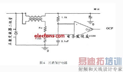 这里采用如图4的方法,在正激变换器扼流圈放置相同匝数的线径较细的线圈。 这两个绕组是磁平衡的,它们之间本应没有电压差。 但是主绕组有直流电阻,大电流时产生了微小的电压差,该电压差由负载电流决定。这个微小的电压差被运放检测,并且通过调节Rx可以设置电流限制。该电路的缺点是电流限制不是很精细的,这是因为铜电阻在温度每上升10℃时增加4%.但是这个电路依然可以满足我们的设计要求。